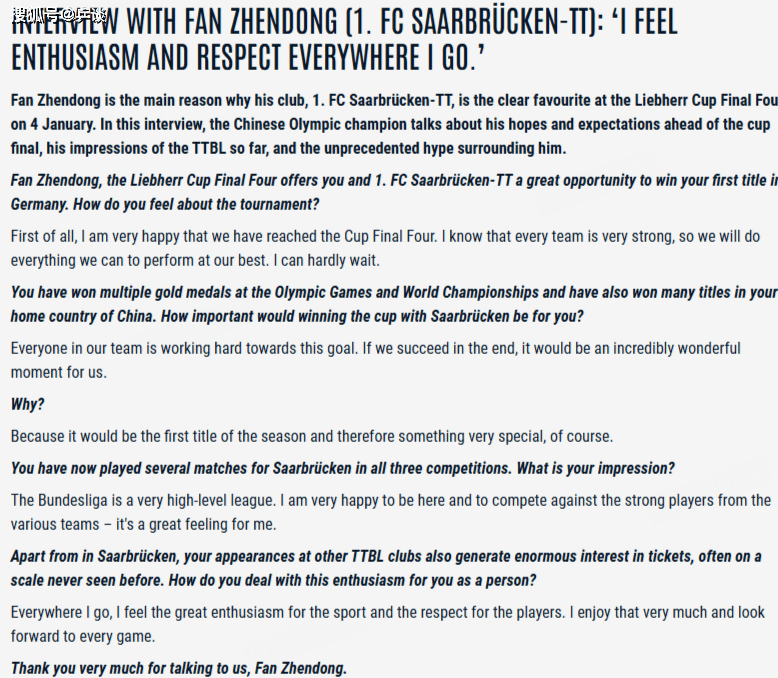 中国球员樊振东近日接受德甲乒乓球联赛专访,谈到了即将到来的德国杯半决赛、决赛、德甲联赛后面几轮,以及德甲的观众氛围等话题。