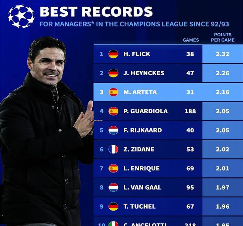 根据最新统计数据显示,在执教欧冠比赛超过25场的主帅中,阿尔特塔以31场比赛积累了67分,场均得分达到2.16分,高居第三位,并且超过了曼城主帅瓜迪奥拉。这一成绩对于一位执教经历尚短的年轻主帅来说,实属不易,彰显出他在战术组织与球队管理上的突出能力。